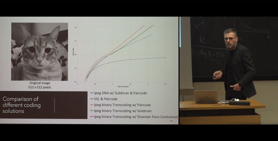 Dans cette présentation, nous parlerons de l'état de l'art en matière de stockage de données ADN pour l'encodage efficace de données numériques dans un code quaternaire constitué des 4 bases ADN A (Adénine), T (Thymine), C (Cytosine) et G (Guanine). Nous présenterons également une nouvelle solution prometteuse de codage d'images numériques dans de l'ADN synthétique que nous avons développée au laboratoire I3S au cours des 5 dernières années et qui prend en compte les contraintes liées au stockage des données sur ADN tout en optimisant le compromis qualité de compression et coût de synthèse.